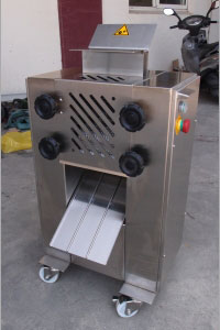 6、確認(rèn)旋轉(zhuǎn)方向正確后,把帶筋膜的肉,皮朝下放在刀片上,輕踩腳踏板把肉往前推即可。